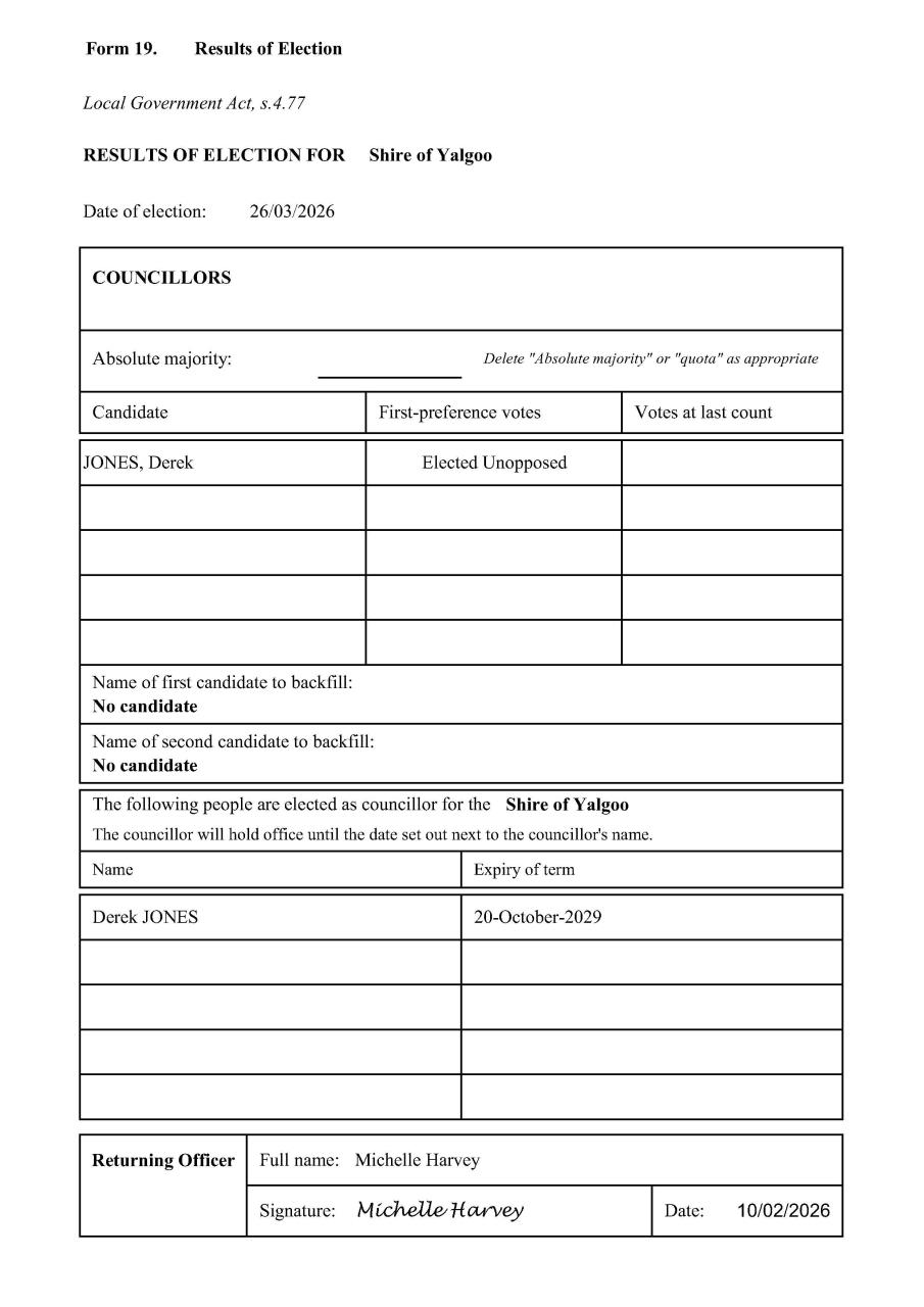 2026 Ordinary Election - Results of Election for Shire of Yalgoo